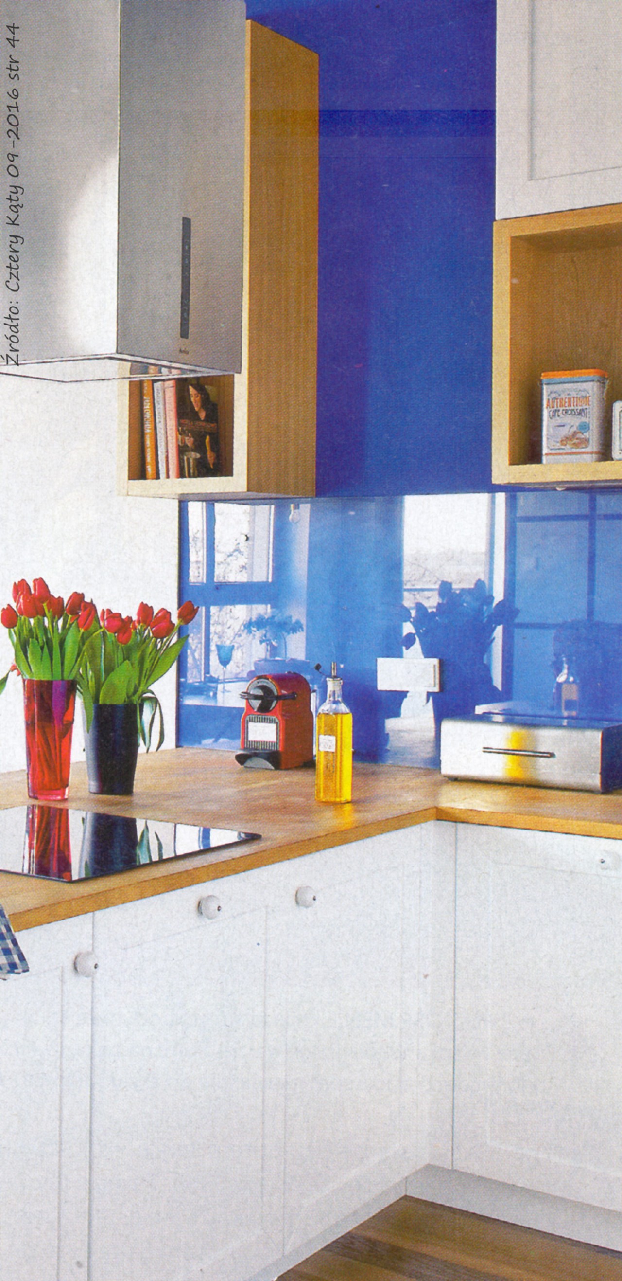 Jak uchronić piękną ścianę przed kuchennymi zabrudzeniami? Cztery Kąty (09-2016) proponują zastosować bezbarwną szybę. Przestrzeń między ścianą a panelem szklanym powinna być zabezpieczona przed dostawaniem się do niej owadów lub zanieczyszczeń - to w przypadku montażu na stałe. Inne rozwiązanie polega na umożliwieniu łatwego zdjęcia szkła w celu umycia. Dostępne na rynku okucia umożliwiają zastosowanie obu wariantów.