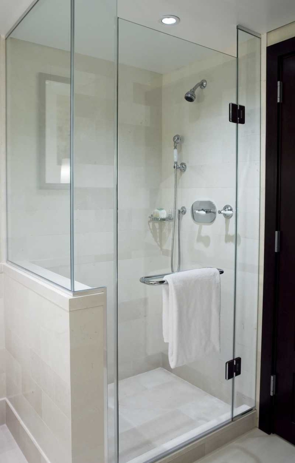 Szklane ścianki stałe. Nie ma drzwi, nie ma zatem zapory dla pryskającej wody. Częściową ochronę stanowi szyba. Najlepiej sprawdzają się, gdy mają duże wymiary, aby woda pozostawała w ich obrębie. Stąd i łazienka powinna być duża.